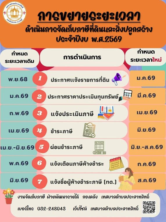 เทศบาลตำบลประสาทสิทธิ์ ขอประชาสัมพันธ์ การขยายระยะเวลา การดำเนินการจัดเก็บภาษีที่ดินและสิ่งปลูกสร้าง ประจำปีงบ พ.ศ. 2569