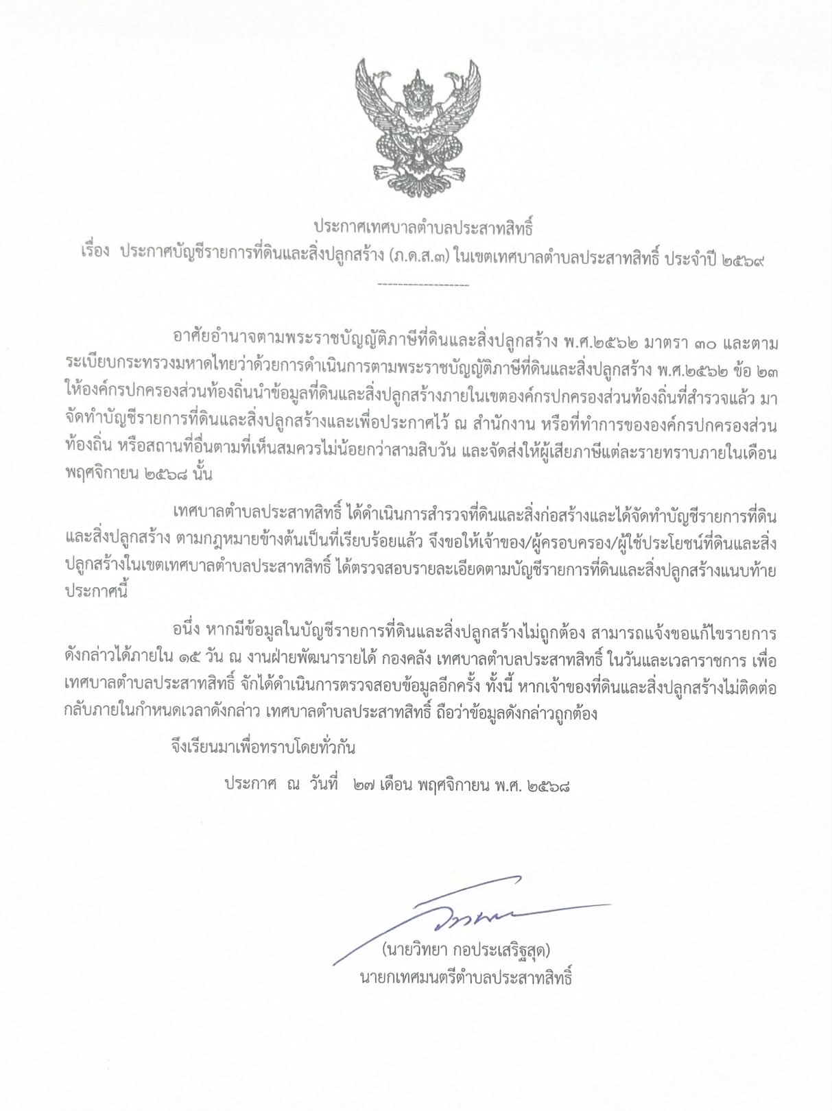 ประกาศ ทต.ประสาทสิทธิ์ เรื่อง ประกาศบัญชีรายการที่ดินและสิ่งปลูกสร้าง (ภ.ด.ส.3) ในเขตเทศบาลตำบลประสาทสิทธิ์ ประจำปี 2569