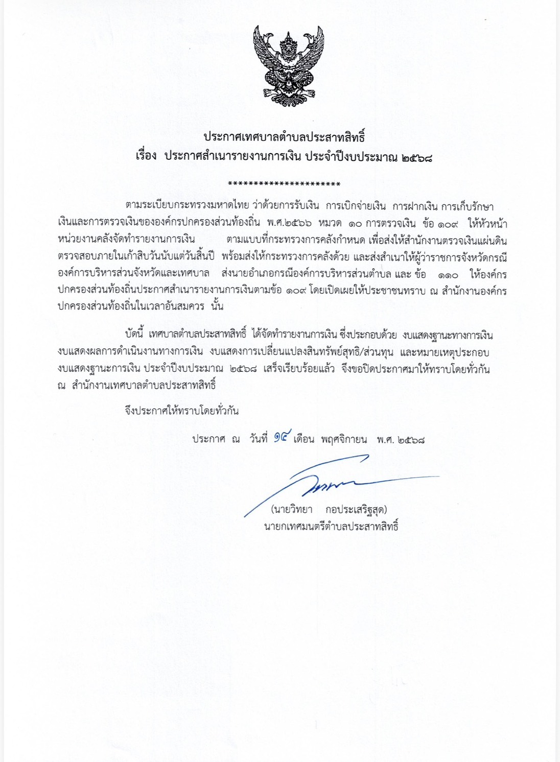 ประกาศ ทต.ประสาทสิทธิ์ เรื่อง ประกาศสำเนารายงานการเงิน ประจำปีงบประมาณ 2568