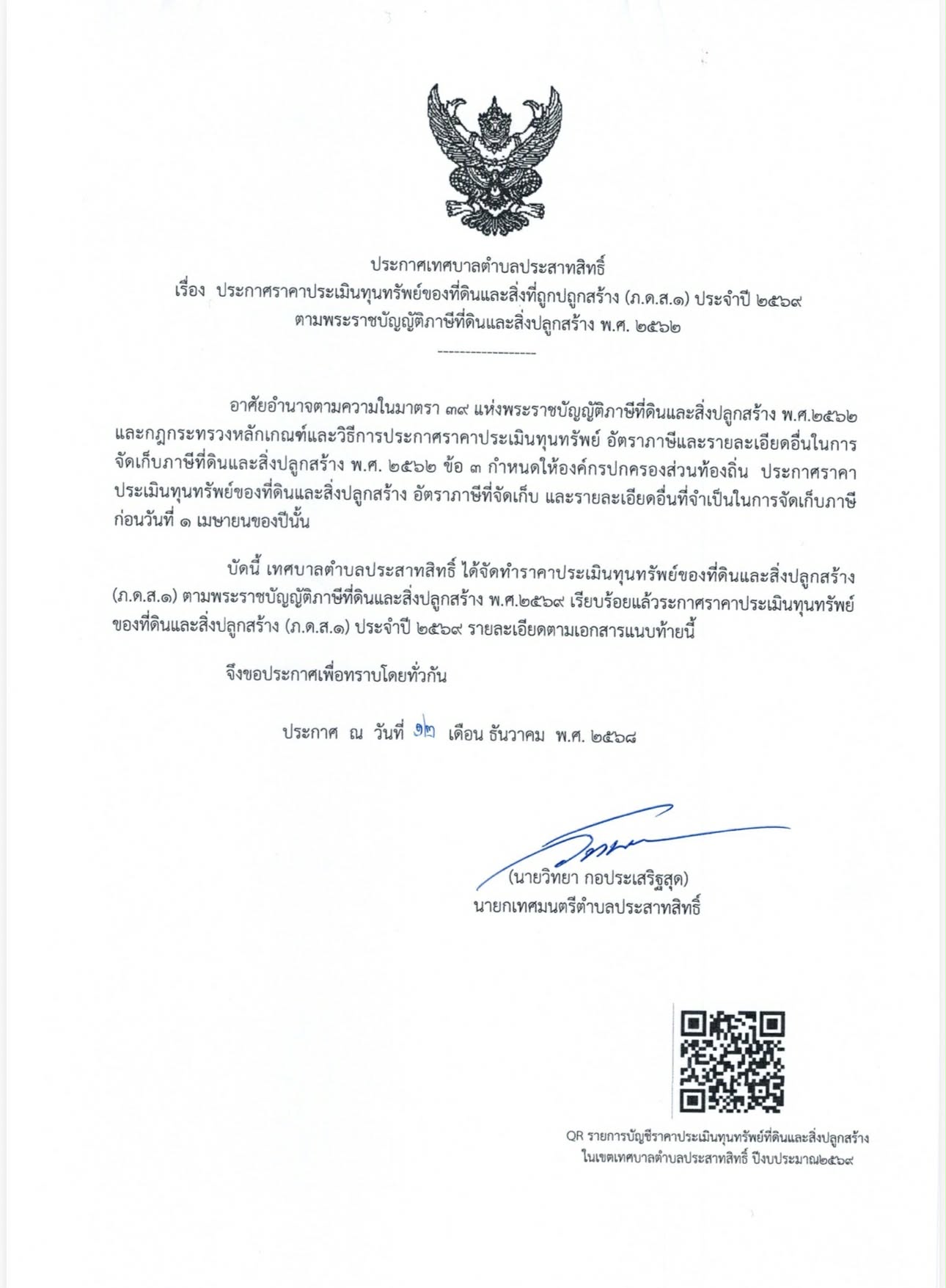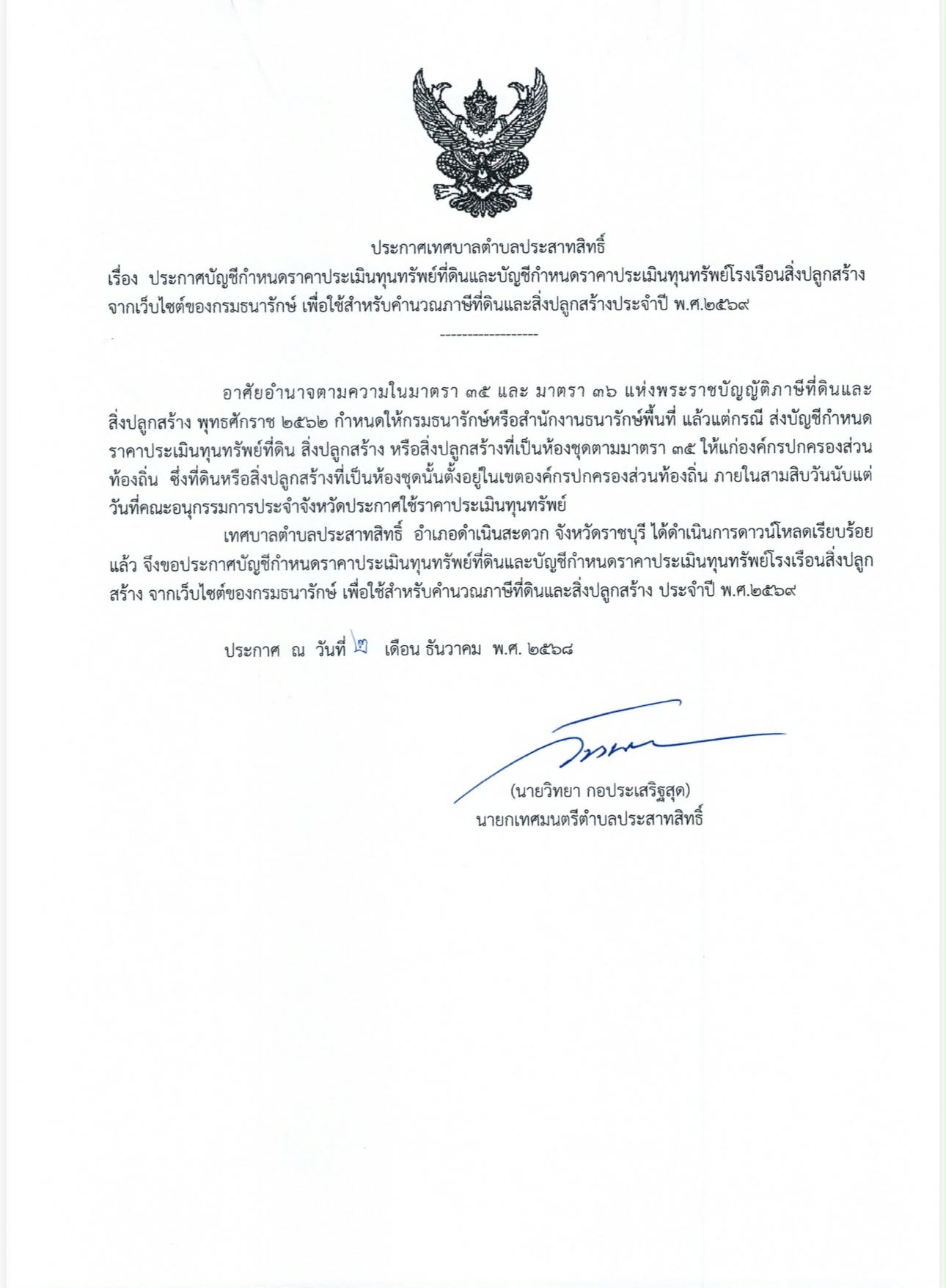 ประกาศ ทต.ประสาทสิทธิ์ เรื่องประกาศราคาประเมินทุนทรัพย์ของที่ดินและสิ่งปลูกสร้าง (ภ.ด.ส.1) ประจำปี 2569 ตามพระราชบัญญัติภาษีที่ดินและสิ่งปลูกสร้าง พ.ศ.2562