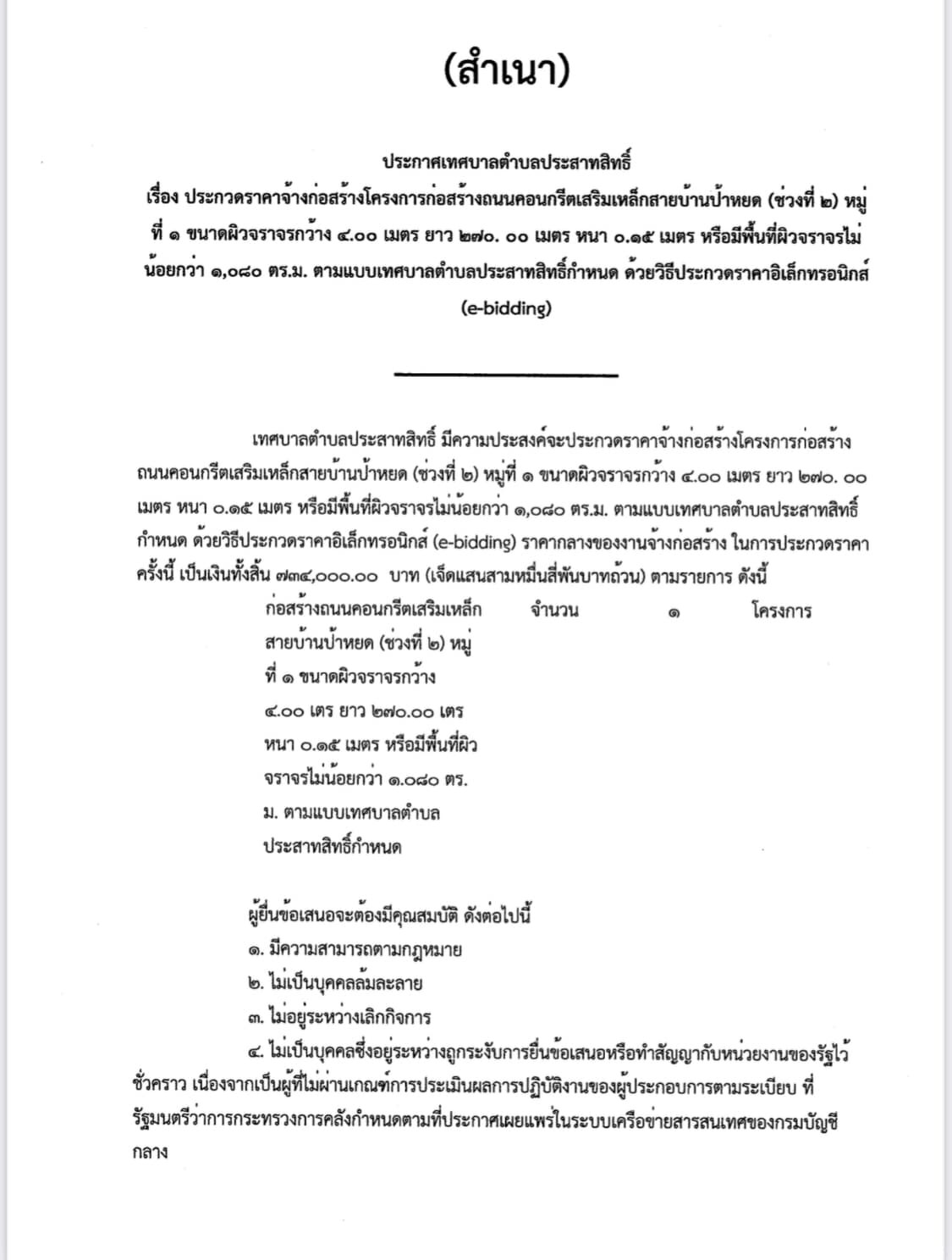 ประกาศ ทต ประสาทสิทธิ์ เรื่องเปิดเผยราคากลางและการคำนวณราคากลางจัดซื้อจัดจ้าง โครงการก่อสร้างถนนลูกรังพร้อมหินคลุก สายบ้านนายก๋อง หมู่ที่3 ด้วยวิธีประกวดราคาอิเล็กทรอนิกส์ (e-bidding)